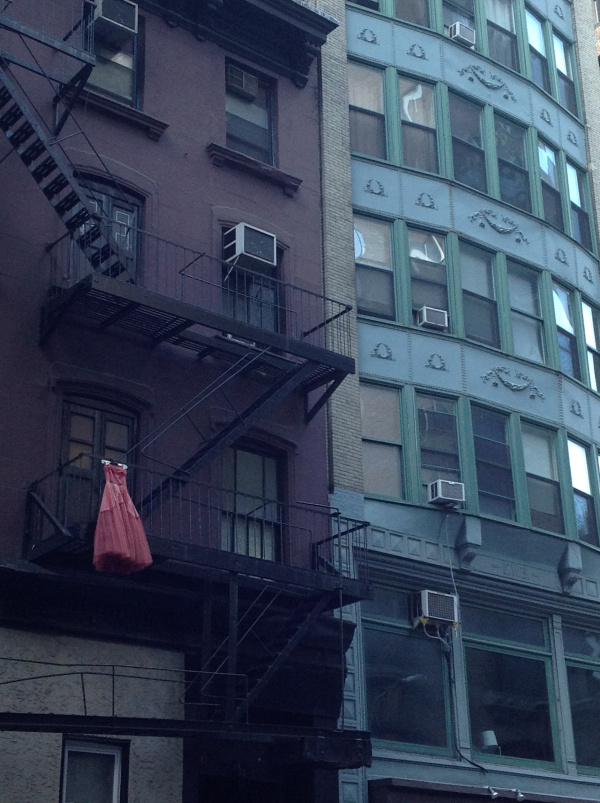 The woman in the red dress is suspended from the fire escape, arm muscles straining, fingertips loosening, loosening…